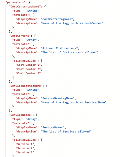 The tag values are parameterized, and allowed values for Cost Center and Service Names bound to a predetermined set of values in the JSON definition.