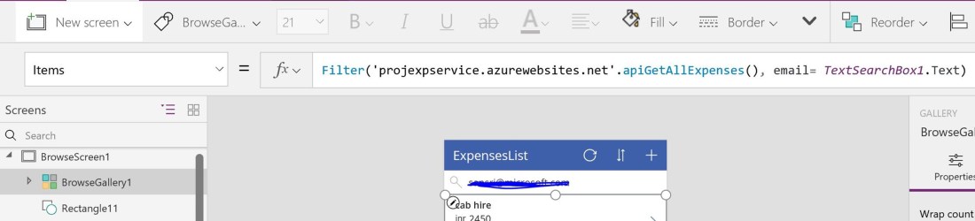 To work around this, I have created a Custom List in Office 365, that has the same fields as in the Expense data returned by the Function App. I used the wizard to generate a complete App based on the Custom List in Office 365, and then changed all the Data Source references from it to the ‘ProjExpensesAPI’ Connection.