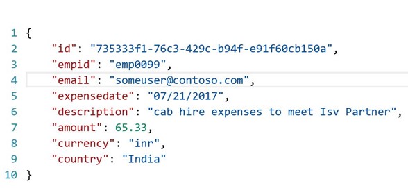 Use the Azure portal to create a DocumentDB database. For the use case described in this article, created is a Collection (expensescol) that stores Project Expense details, comprising the attributes shown below.