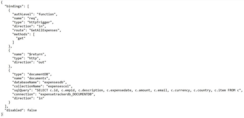Notice that there are 2 output bindings here, one for the HttpResponse and the other is the binding to Cosmos DB to insert the expense record into it.