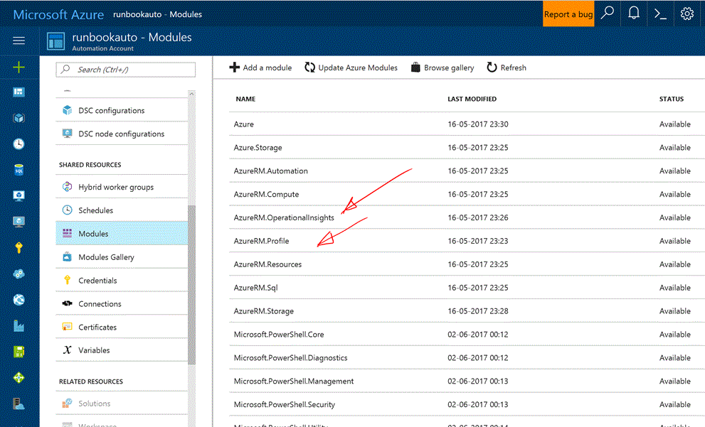 Note: To execute the above Runbooks, the Automation Service requires certain Modules to be available. Import them into the Automation Account in case they are not. Refer to this link for more details on these Modules – the names are: