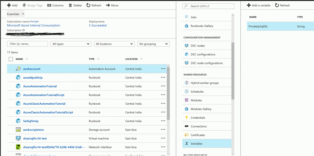- In the Azure portal, for this Automation Account, create a variable that would store the Private IP Address of the Azure VM running the SQL Server database. In the scenario described here, the Variable name used is PrivateIpSqlDb