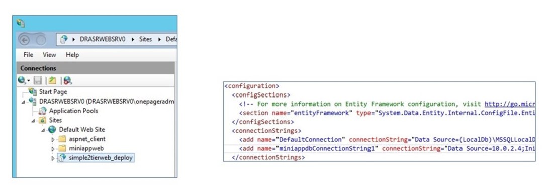 – The Web Application name used is simple2tierweb_deploy, and it is added as an Application within the ‘Default Web Site’ on IIS on the Web Server. See the screen shot below